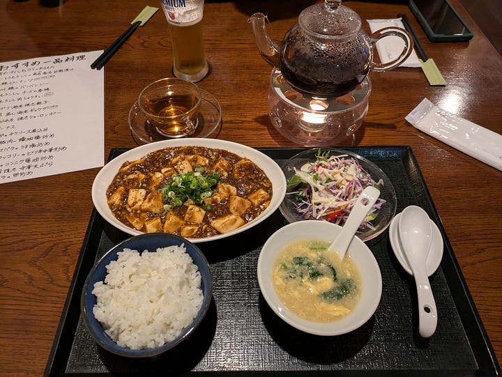 Last night we tried a new local restaurant — this was more of a Japanese-style Chinese restaurant. The tables were low, but E was relieved to find a well for our feet (rather than sitting like a pretzel); there was was delicious oolong tea, served with a candle warmer; and the featured dessert was black sesame jello with honey (pretty tasty!)