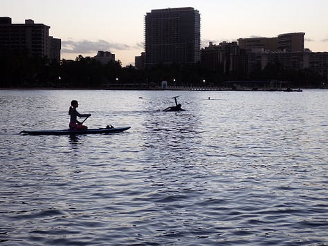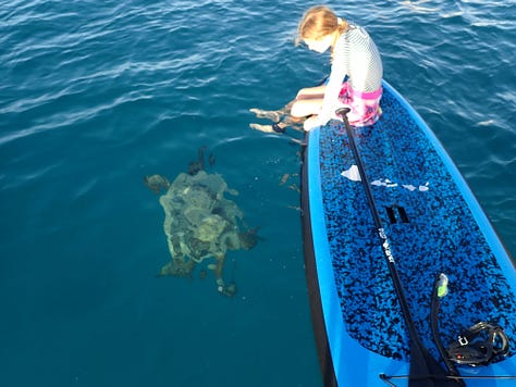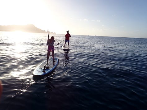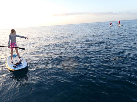 E, M, and I even got to do a sunrise paddleboard tour. We paddled out past the breakers and over to a shelf reef that our guide called “Turtle Canyon”. There we found lots of large Green Sea Turtles, some tropical fish, and even a pod of dolphins passing through.